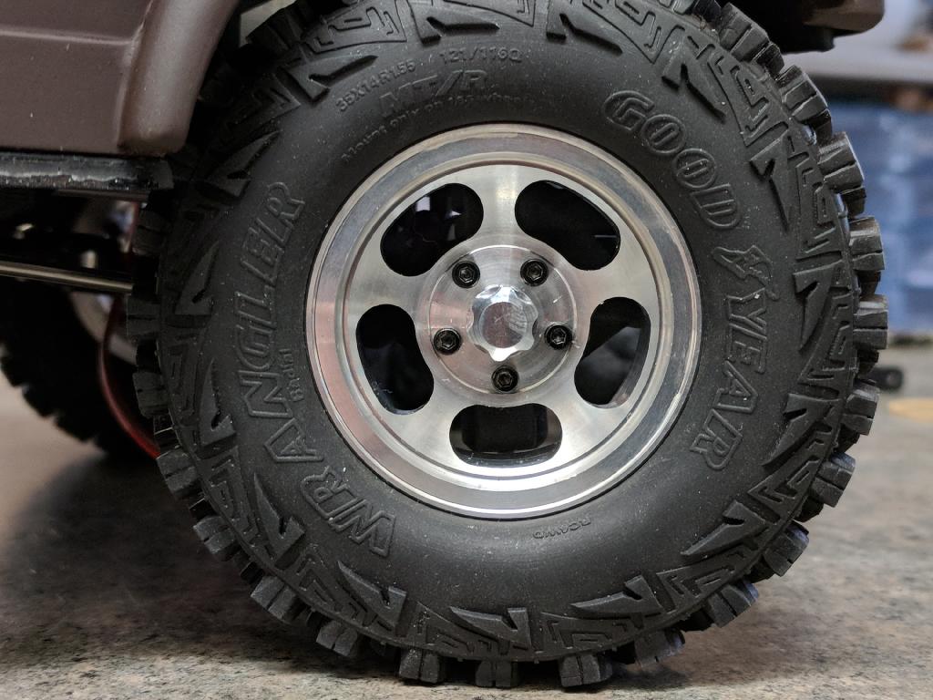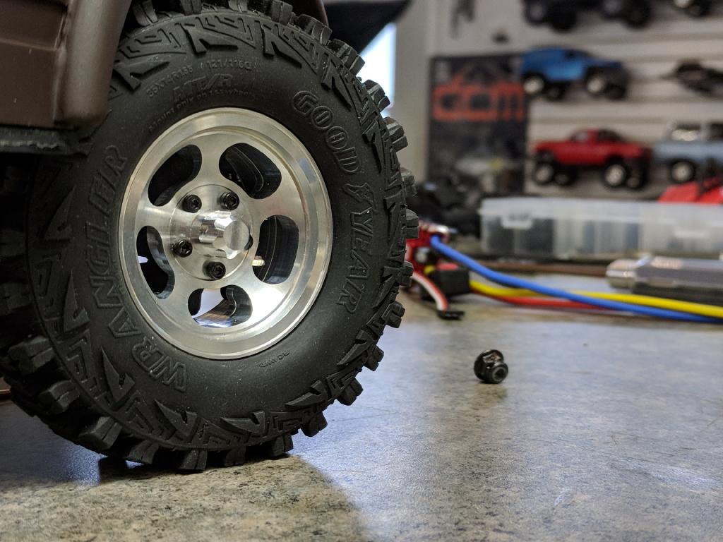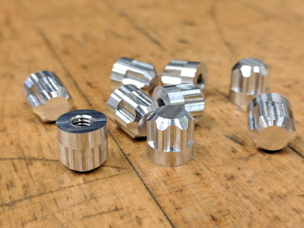 Our new SIMPLE hub threads on like a nut, but gives scale looks! Each hub has 7mm long of M4 thread inside, all contained inside the hub with no removable parts or extra nuts buried inside. Just a simple, straight, solid machined aluminum nut with great scale looks. These tiny hubs are only 9mm around, and only 9mm tall in total.